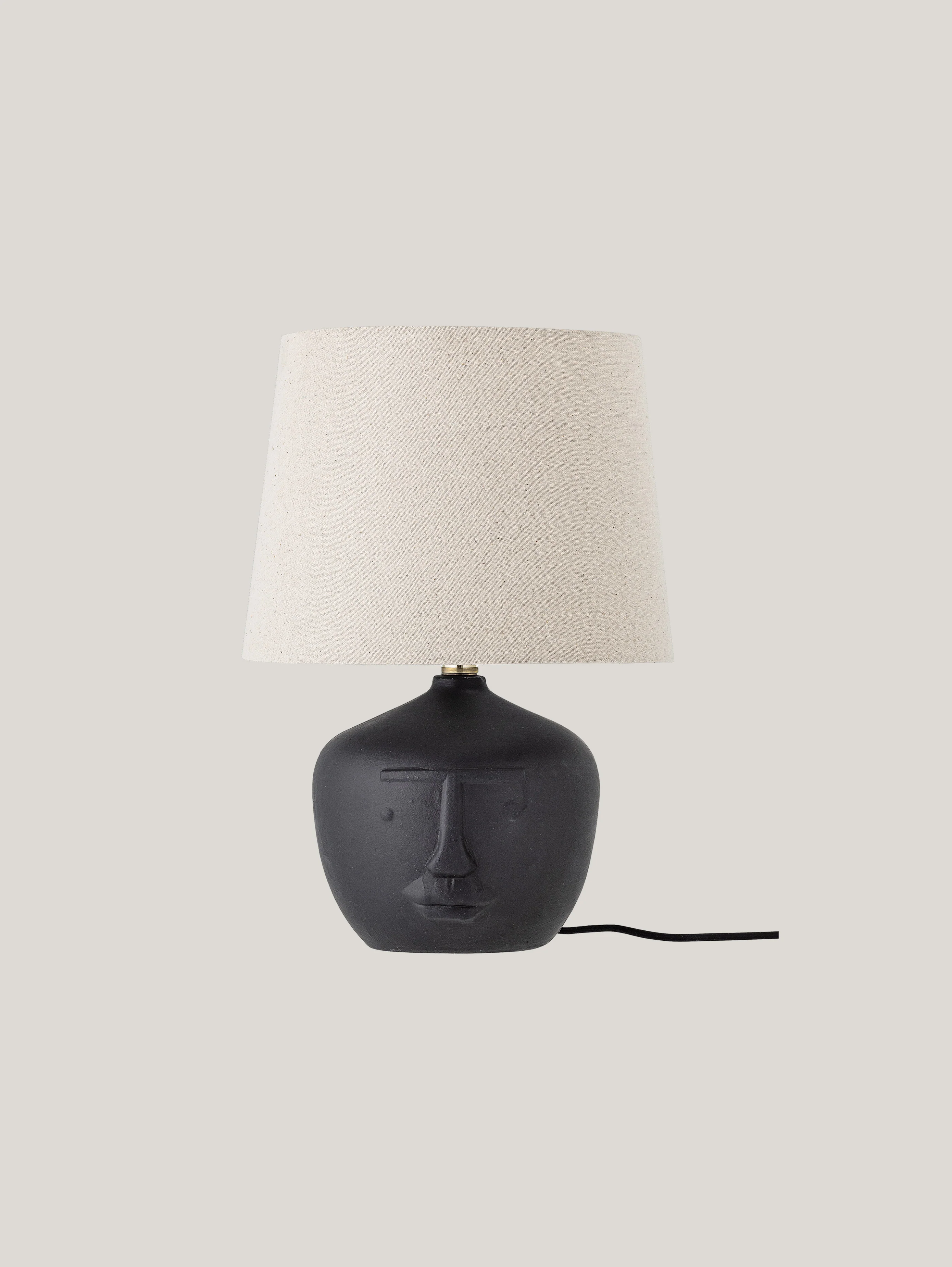 Le socle de la lampe est le véritable point de mire : en terre cuite noire, il est décoré d'un motif qui rappelle les contours stylisés d'un visage, transformant la lampe en un objet décoratif qui attire l'attention. Ce détail artistique ajoute de la profondeur et du charme, faisant de Matheo l'objet idéal pour ceux qui aiment combiner fonctionnalité et art.